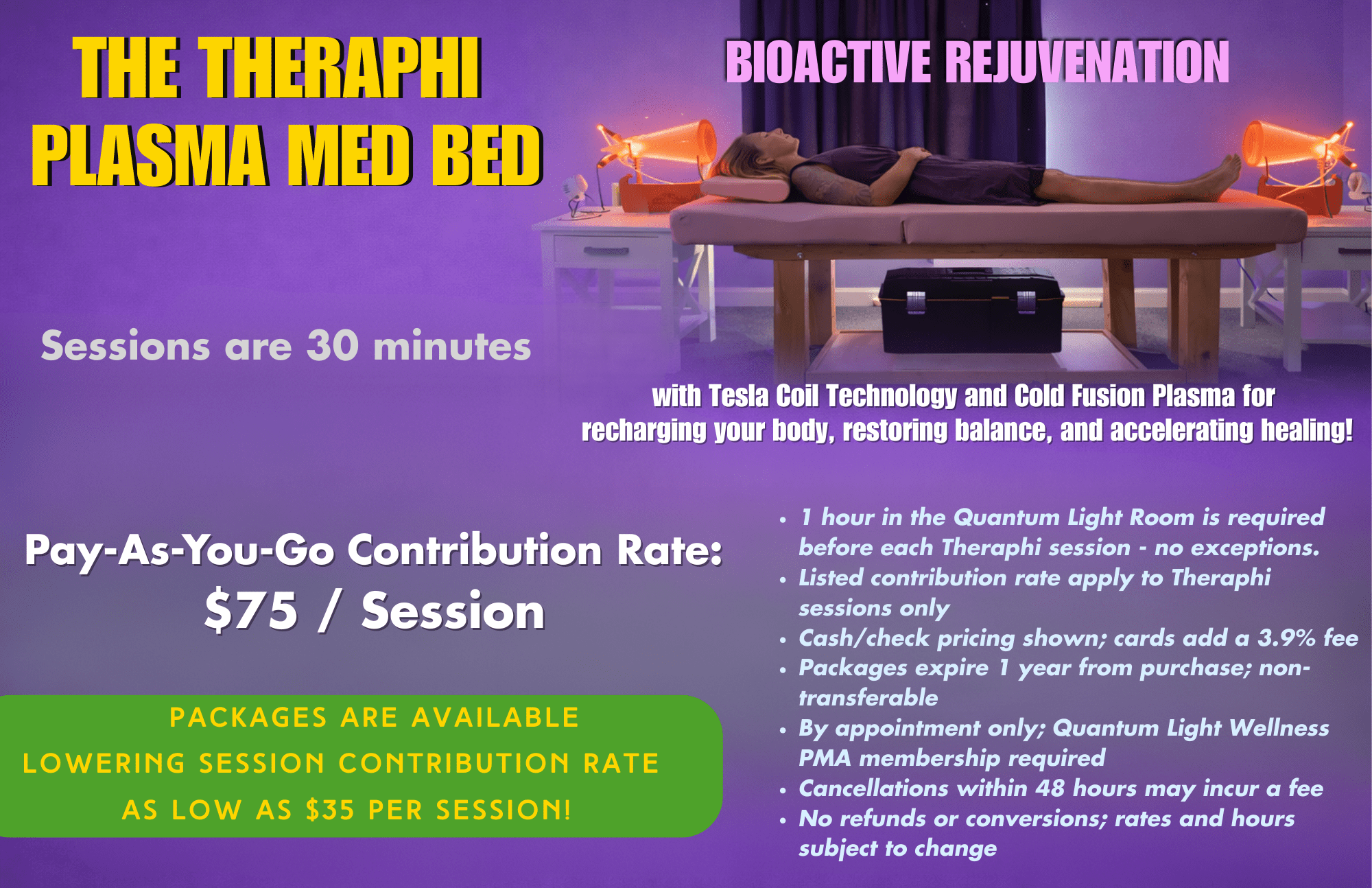 - Directed Energy: The normal orientation of the Theraphi/Plasma Med Bed bulbs is to have one at the head and one at the feet while a person lays on the table in between the two plasma bulbs. However, Members can alternatively elect to have the bulbs directed at a specific area of their body for a greater, enhanced benefit in those areas where additional focus may be desired.