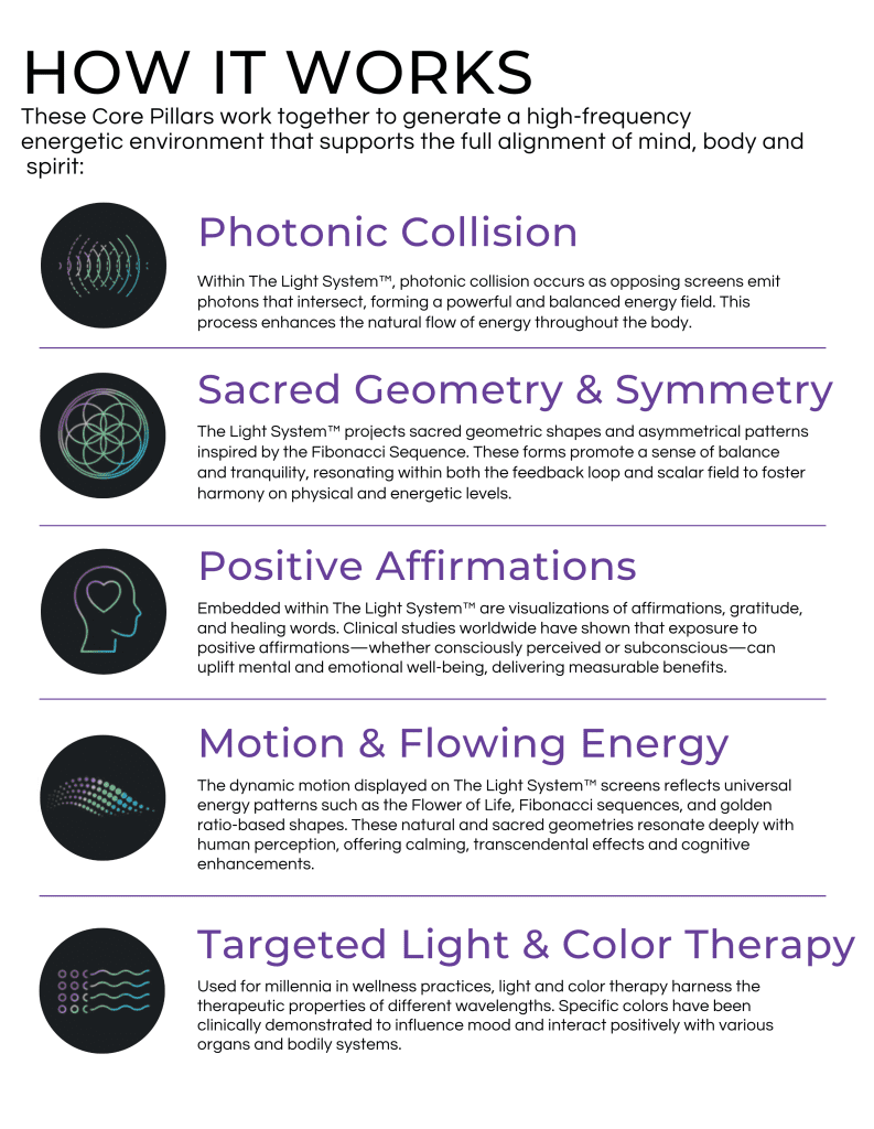 During your time in the system, the 52 field-generating panels are laser aligned to create a quantum bio-photonic field of life-enhancing frequencies that bathe you in pure light energy. The body responds to the field with its innate wisdom, allowing recalibration to homeostasis and greater health.