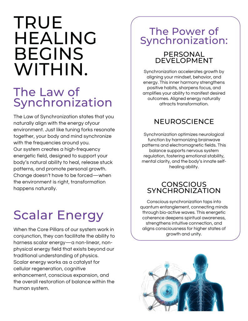 The technology doesn’t heal the body. The technology creates an ultra healthy environment that charges the body energetically which enhances the ability for the body to heal itself by enhancing all 4 aspects of energetic wellness: The Physical, Mental, Emotional, and Spiritual.